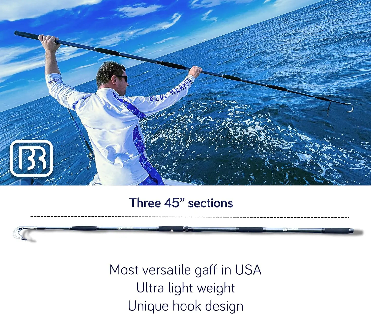 We were in need of a multifunction, light and portable gaff... aluminum pipe with generic hook did't fit our expectations. So we started Blue Reaper journey. In South Carolina while Gulf fishing 60 miles out is no room for tackle failure...- "Fish Shall Not Pass" During King Mackerel tournaments third extension is absolutey crucial, delivering extended gaffing distance combined with lightweight fast action -For The Win! For relaxing bottom fishing or inshore, everyone should feel extremely comfortable with first section of Blue Reaper. Our Marine Grade Stainless Steel, made to order, engraved hook with lazer sharp tip delivering 100% penetration- cause "Fish Shall Not Pass" Please enjoy our product and any suggestions to improve it please send us email at -bluereaperusa@gmail.com SLAY THAT FISH!